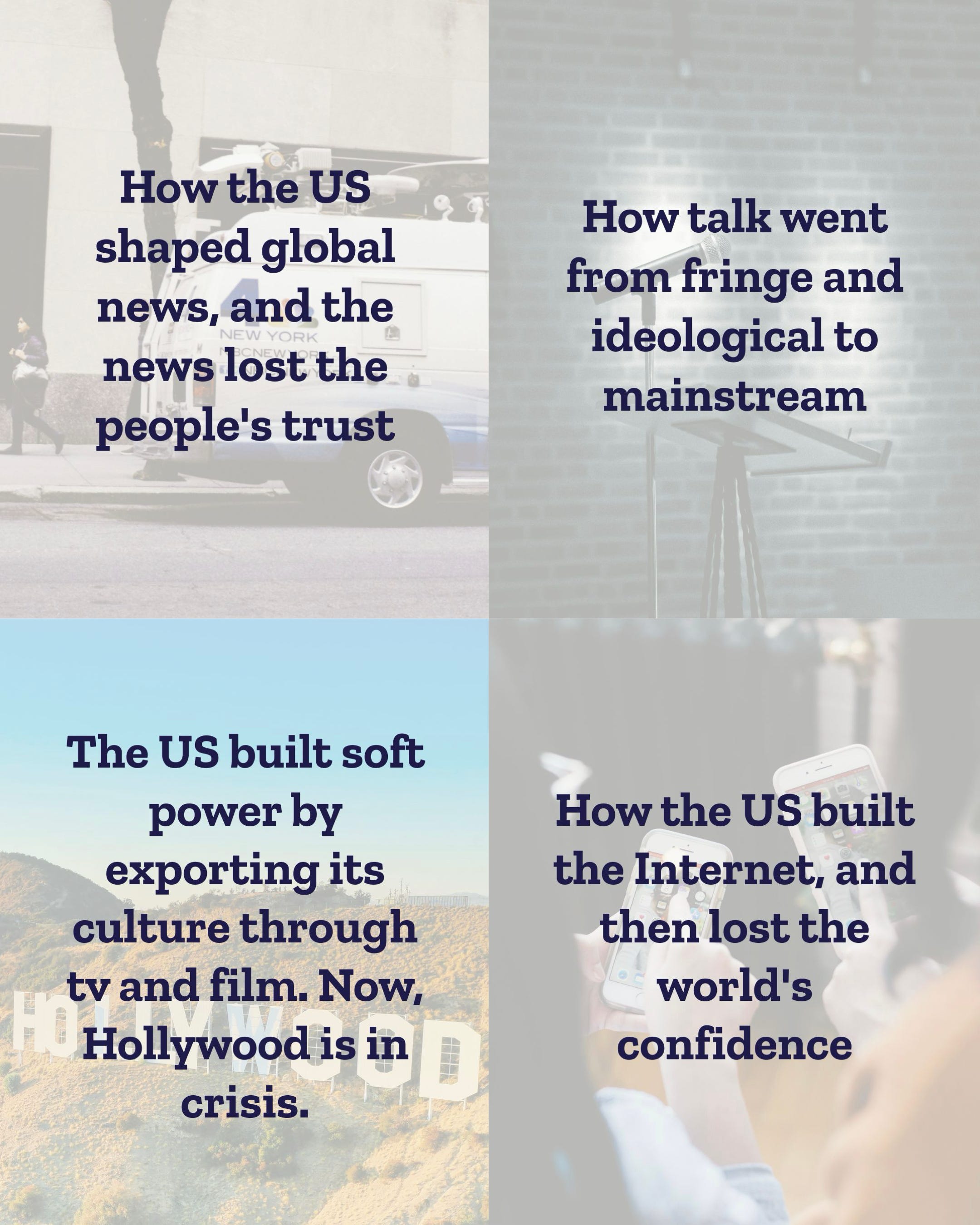 For as long as most living Americans can remember, the United States’ position as world leader has felt unshakable. US innovation revolutionized global media and information – from CNN’s 24 hour news format to Hollywood’s export of American culture to Facebook’s democratization of speech. But the age of American dominance in global soft power is ending – ironically, much of it by the US’ own hand.